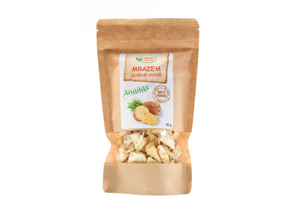 Mrazem sušený ananas jsou čistě přírodní křupavé kousky ananasu bez konzervantů a barviv zakonzervované odpařením vody z ledu. Tento proces se nazývá lyofilizace a odstraňuje z ovoce 98%-99% vody. Ovoce si tak zachovává téměř všechny původní vlastnosti jako čerstvé ovoce, obzvláště zůstávají zachované veškeré vitamíny, minerály a další zdraví prospěšné látky. Lze jej snadno a dlouhodobě skladovat. Lyofilizované ovoce má křupavou strukturu a široké využití od rychlé svačinky přes chutné a zdravé snídaňové směsi a smoothies až po přípravu široké škály pokrmů a dezertů. Ananas obsahuje přirozeně se vyskytující cukry, tuky, vlákninu, vitaminy skupiny B, vitamín A a C a minerály jako například vápník, železo, draslík a fosfor.