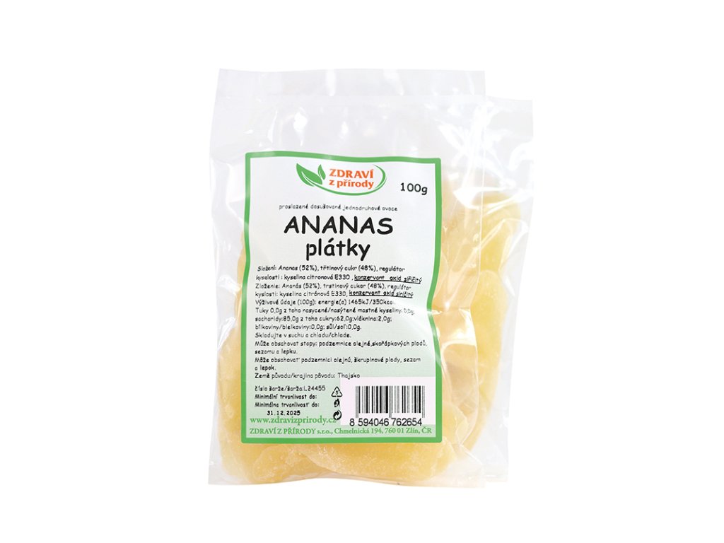 ananas 52%, třtinový cukr 48%, regulátor kyselosti, kyselina citronová E330, konzervant oxid siřičitý E220