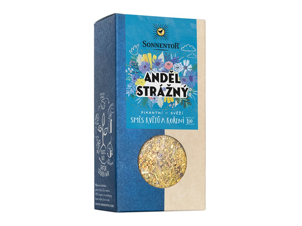 Anděl strážný je lahodná směs koření, která obsahuje celou řadu tělu prospěšných bylin a koření. Svěží máta podpoří trávení. Zázvor s česnekem jí dávají jemnou ostrost a mrkev s koriandrem přirozenou sladkost. Hodí se zejména na rýži, kuře, jehněčí a zeleninu, ale také do těstovin a salátových dresinků. Poznejte tohoto chutného anděla strážného.