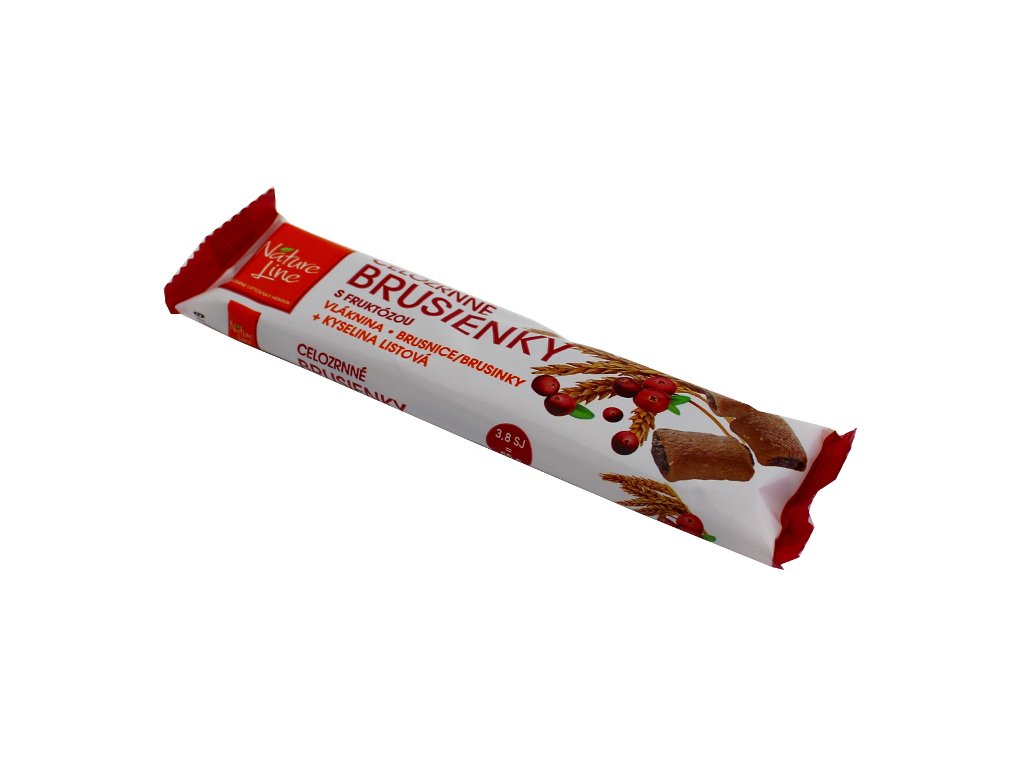 Celozrnné sušenky s náplní z brusnice (38%)jsou sušenky s vlákninou, obohacené o kyselinu listovou, jsou vhodným rychlým občerstvením při fyzické zátěži, sportovních výkonech, v práci, ve škole nebo při cestování.