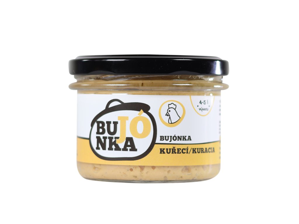Kuřecí bujónka je jemná pasta plná chutí, vyrobená pouze z přírodních surovin nejvyšší kvality - z masa z českých farem, čerstvé zeleniny, bylinek, koření a soli. Bujón neobsahuje žádnou chemii, lepek ani laktózu a proto je vhodný pro alergiky a dietní stravování. Pasta slouží k jednoduchému a rychlému ochucení polévek, omáček a masových i zeleninových pokrmů a směsí, stejně tak dobře, jako k ochucení příloh.