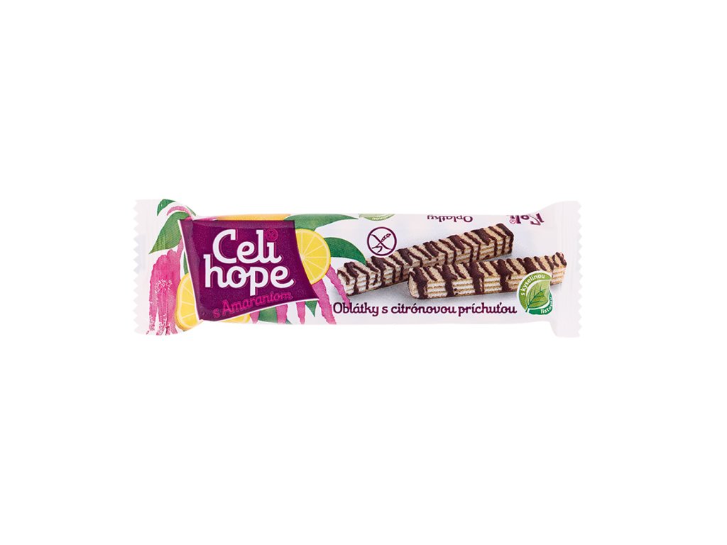 Nabídka bezlepkových oplatek z řady Celihope obsahuje oplatky vanilkové , oříškové , mléčné polomáčené, kokosové , kávové , dortové , citrónové , arašídové a arašídové máčené