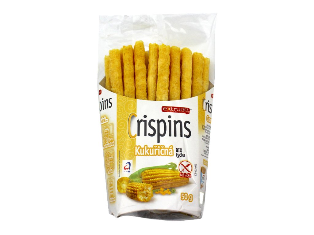 Křehké bezlepkové tyčinky Crispins Bio jsou extrudované křupavé tyčinkynky v biokvalitě s vysokým obsahem vlákniny a nízkým obsahem tuku a soli, bez přidaného cukru, vyrobené z kukuřičné mouky, kde kukuřice je přirozeně bezlepkovou a nutričně velmi bohatou potravinou, má vysoký obsah vitamínů skupiny B a obsahuje rovněž minerální látky jako je železo, hořčík, zinek, mangan a selen.