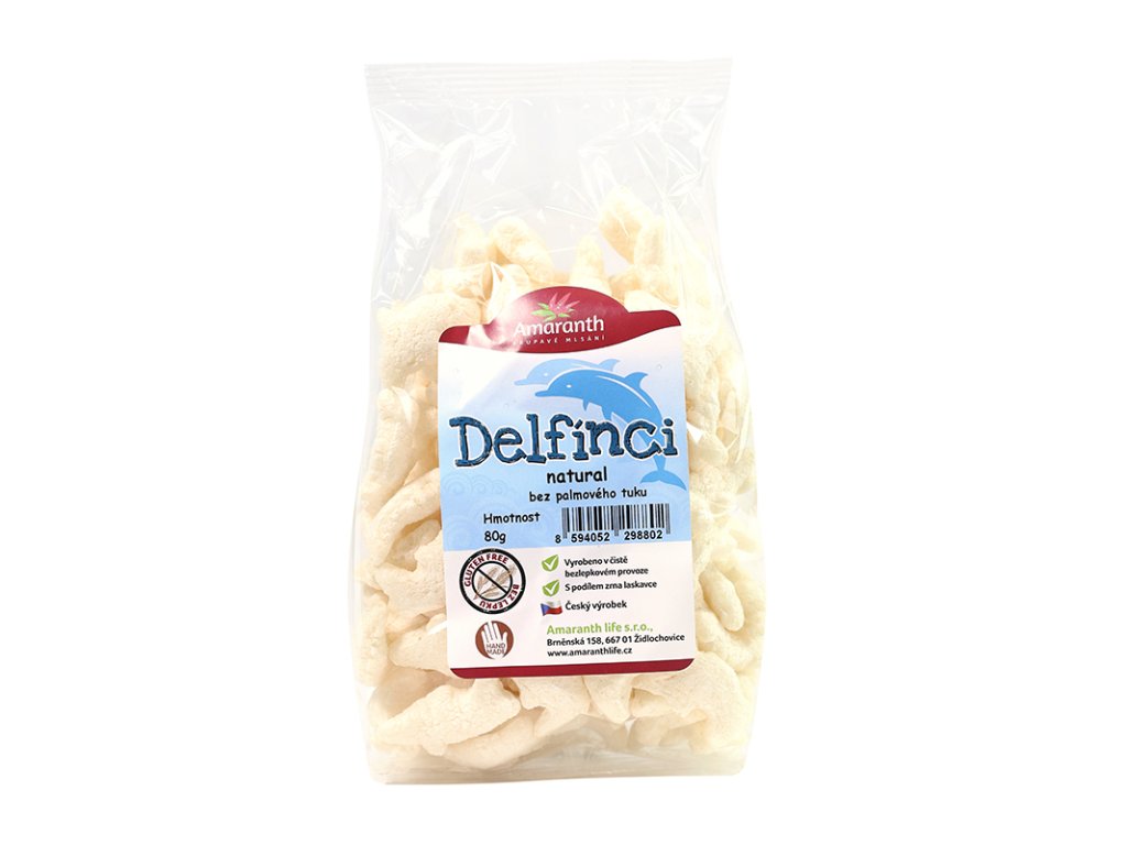 Bezlepkové křupky natural ve tvaru delfínků jsou zdravou alternativou křupek s jemnou oříškovou chutí. Amarantová mouka navíc dodává produktu větší podíl bílkovin a vlákniny než běžné kukuřičné lupínky.