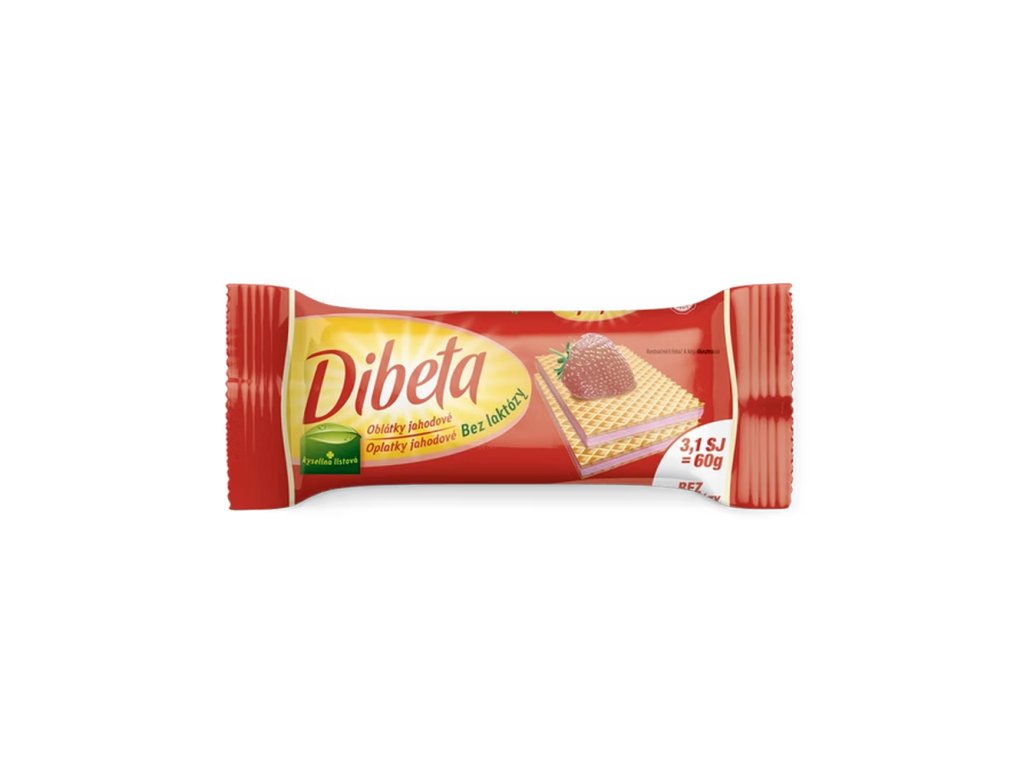 Jahodová oplatka Dibeta je bezlaktózová oplatka s krémovou jahodovou náplní (73%) a kyselinou listovou. Je vhodná k rychlému doplnění energie pro sportovce, při fyzické nebo psychické zátěži.