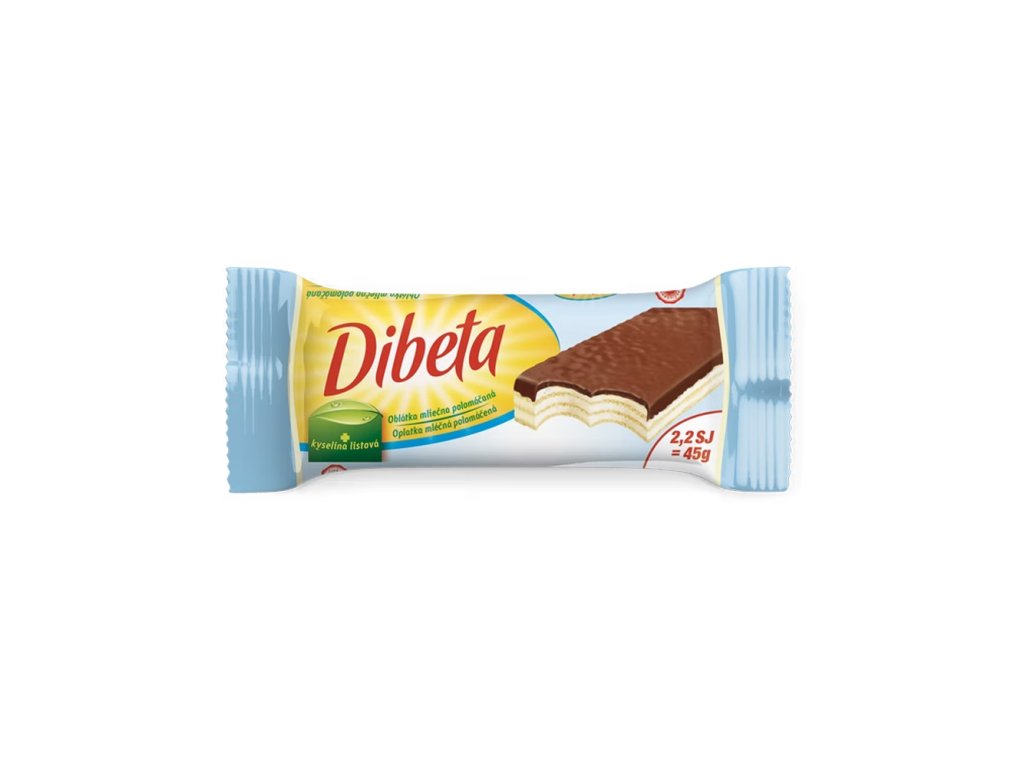 Mléčná oplatka Dibeta je oplatka s mléčnou krémovou náplní (70%), polomáčená v kakaové polevě s fruktózou a kyselinou listovou. Je vhodná k rychlému doplnění energie pro sportovce nebo při fyzické a psychické zátěži.