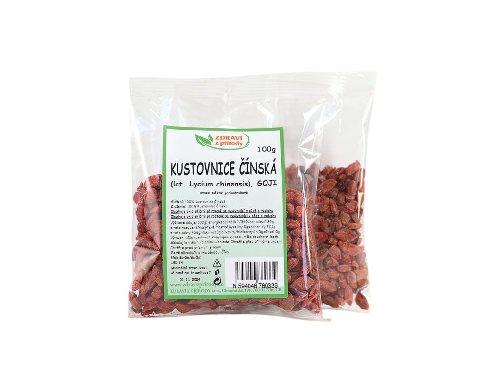 Goji jsou sušené plody kustovnice čínské. Obsahují 18 druhů aminokyselin a až 21 stopových prvků, mezi něž patří zinek, železo, měď, vápník, germanium, selen a fosfor. V porovnání s jinými plody jsou Goji jedním z nejbohatších zdrojů karotenoidů, obsahují beta karoten, zeaxantin, lutein, lykopen, kryptoxantin a xantofyl. Z viramínů obsahují goji mimo jiných hlavně vitamín C, B1, B2, B3, B6 a E.