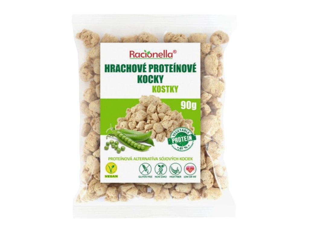 Hrachové kostky jsou bezlepkový extrudovaný výrobek, který přírozeně neobsahuje cholesterol. Jsou oblíbenou rostlinnou alternativou masa vyrobenou z hrachové mouky. Vynikají vysokým obsahem bílkovin, nízkým množstvím tuku a výbornou schopností nasáknout chuť koření, marinád a omáček. Po namočení a krátké tepelné úpravě získají příjemnou, masitou konzistenci a jsou ideální do každodenní kuchyně. Díky dlouhé trvanlivosti, jednoduché přípravě a výborné nutriční hodnotě jsou hrachové kostky vhodnou volbou pro všechny, kdo hledají zdravý a cenově dostupný zdroj bílkovin.