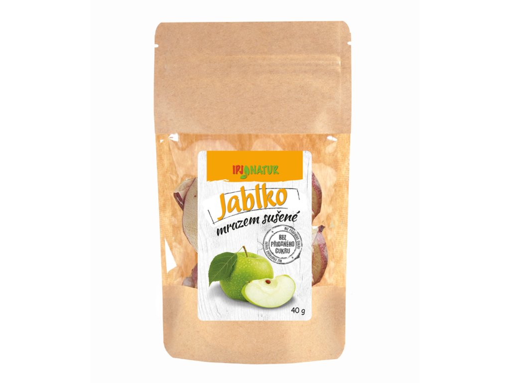 Mrazem sušená jablka jsou čistě přírodní křupavé plátky jablek bez konzervantů a barviv zakonzervované odpařením vody z ledu. Tento proces se nazývá lyofilizace a odstraňuje z ovoce 98%-99% vody. Ovoce si tak zachovává téměř všechny původní vlastnosti jako čerstvé ovoce, obzvláště zůstávají zachované veškeré vitamíny, minerály a další zdraví prospěšné látky. Lyofilizované ovoce je lehké, snadno a dlouhodobě skladovatelné. Má křupavou strukturu a široké využití od rychlé svačinky přes chutné a zdravé snídaňové směsi a smoothies až po přípravu široké škály pokrmů a dezertů. Jablka obsahují vitamíny a minerály, také pektin - rozpustnou vlákninu, která zajišťuje vysokou sytost a snadnou stravitelnost. Pro lidský organismus je přínosem kyselina listová a vitamín C. Jablka obsahují řadu minerálů jako je draslík, železo, hořčík nebo vápník.