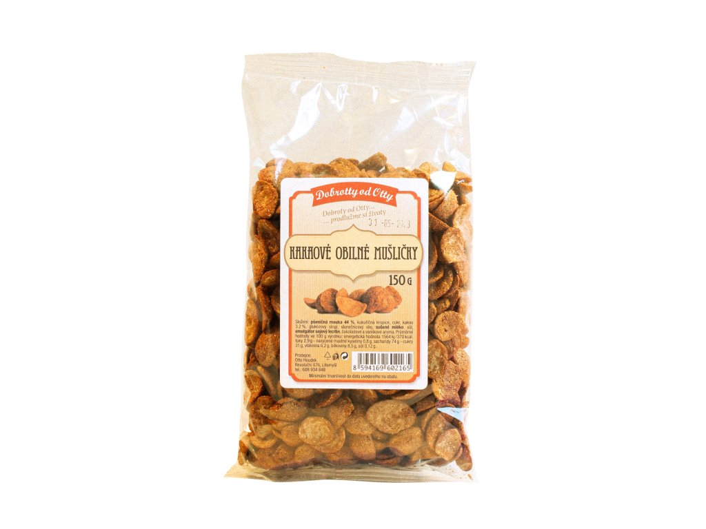 Kakaové obilné mušličky jsou vyrobené z pšeničné mouky a kukuřičné krupice, jsou určeny k přímé konzumaci, nejčastěji jsou oblíbenou volbou k přípravě rychlé a výživné snídaně, lze je ale také využít k výrobě a dekoraci sladkých jídel a dezertů.Pšenice obsahuje širokou škálu živivn, včetně sacharidů, bílkovin, vlákniny, vitamínů a minerálů. Její hlavní složkou jsou sacharidy, především škrob, který slouží jako hlavní zdroj energie. Z vitamínů jsou významné vitamíny skupiny B a vitamín E, z minerálů pak železo, fosfor, hořčík a zinek. Kukuřice je přirozeně bezlepkovou a nutričně velmi bohatou potravinou, má vysoký obsah vitamínů skupiny B a obsahuje rovněž minerální látky (železo, hořčík, zinek, mangan a selen).