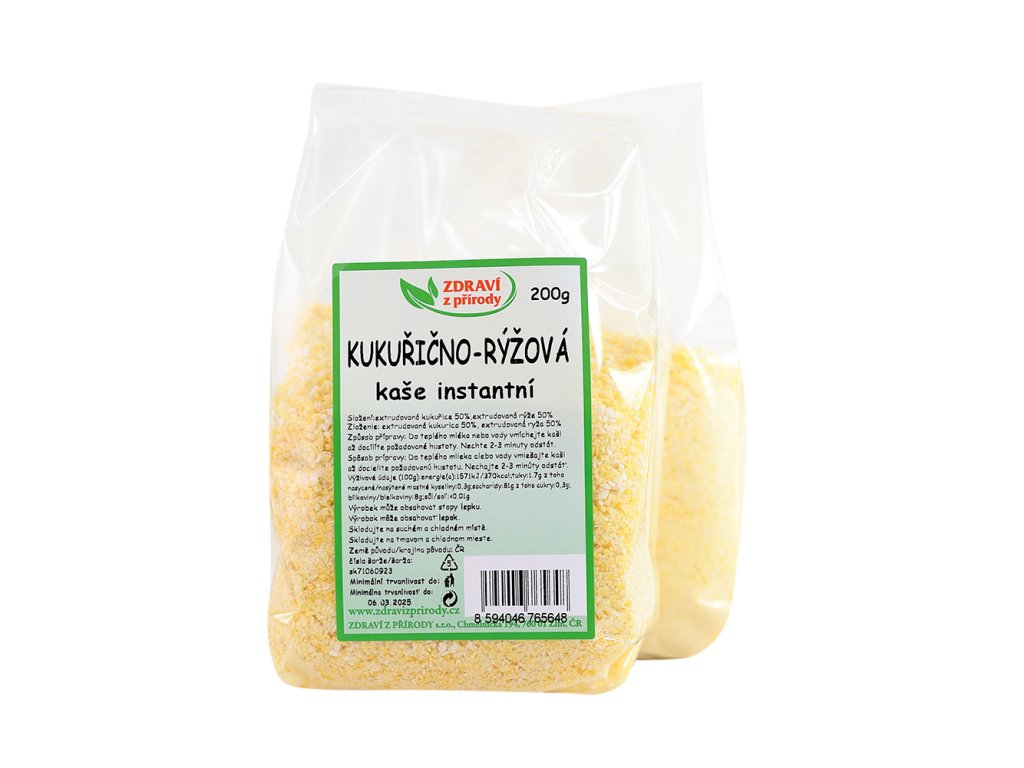 Kukuřično-rýžová kaše je sypká instantní směs pro rychlou přípravu kvalitního pokrmu. Směs je namíchána ze dvou surovin a to z extrudované kukuřice a extrudované rýže.