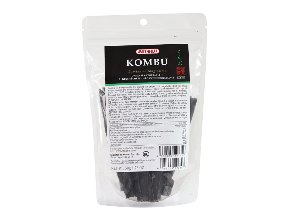 Kombu jsou mořské řasy s vysokým obsahem minerálních látek, vitamínů, bílkovin a vlákniny. Mořské řasy všeobecně jsou zázračná potravina. Obsahují více vitamínů a minerálů než jakákoliv jiná potravina na planetě. Jsou jedním z nejbohatších zdrojů bílkovin a obsahují celé spektrum karotenů, enzymů, aminokyselin, vlákniny a oktakosanolu. Minerály obsažené v mořské zelenině jsou zastoupeny ve stejných poměrech jako minerály, které se nachází v krvi. Jsou bohaté obzvláště na vápník, fosfor, hořčík, železo, jód, zinek a další stopové minerály. Mořské řasy jsou bohaté na vitamíny A,B,C,E a dokonce na vitamín B12. Jsou téměř jediným rostlinným zdrojem vitamínu B12 a obsahují 10 - 20x více minerálů než suchozemské rostliny. Mají protizánětlivé, antimikrobiální a protiplísňové účinky. Doporučená denní dávka jódu je 1g.