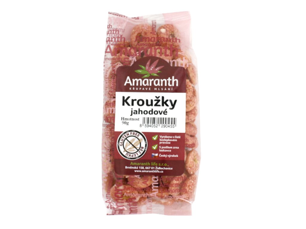 Bezlepkové jahodové kroužky jsou zdravou alternativou křupek s jogurtovou polevou a jahodovou příchutí, které jsou vhodné i pro nejmenší děti. Amarantová mouka navíc dodává produktu větší podíl bílkovin a vlákniny než běžné kukuřičné lupínky.