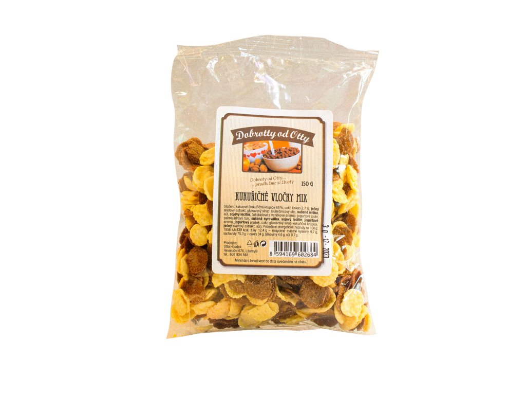 Kukuřičné vločky mix jsou vyrobené z kukuřičné krupice a jsou určeny k přímé konzumaci, nejčastěji jsou oblíbenou volbou k přípravě rychlé a výživné snídaně, lze je ale také využít k výrobě a dekoraci sladkých jídel a dezertů. Kukuřice je přirozeně bezlepkovou a nutričně velmi bohatou potravinou, má vysoký obsah vitamínů skupiny B a obsahuje rovněž minerální látky (železo, hořčík, zinek, mangan a selen).