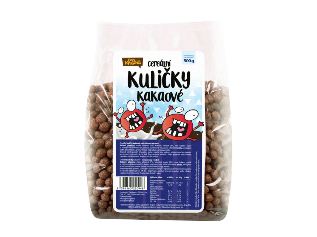 Cereální kakaové kuličky jsou extrudované cereálie určené k přímé konzumaci, s vyšším obsahem vlákniny, vhodné pro děti od 3 let věku.