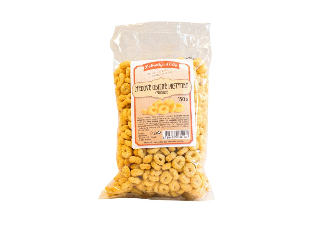 Medové obilné prstýnky jsou vyrobené z pšeničné mouky a kukuřičné krupice, jsou určeny k přímé konzumaci, nejčastěji jsou oblíbenou volbou k přípravě rychlé a výživné snídaně, lze je ale také využít k výrobě a dekoraci sladkých jídel a dezertů. Pšenice obsahuje širokou škálu živivn, včetně sacharidů, bílkovin, vlákniny, vitamínů a minerálů. Její hlavní složkou jsou sacharidy, především škrob, který slouží jako hlavní zdroj energie. Z vitamínů jsou významné vitamíny skupiny B a vitamín E, z minerálů pak železo, fosfor, hořčík a zinek. Kukuřice je přirozeně bezlepkovou a nutričně velmi bohatou potravinou, má vysoký obsah vitamínů skupiny B a obsahuje rovněž minerální látky (železo, hořčík, zinek, mangan a selen).