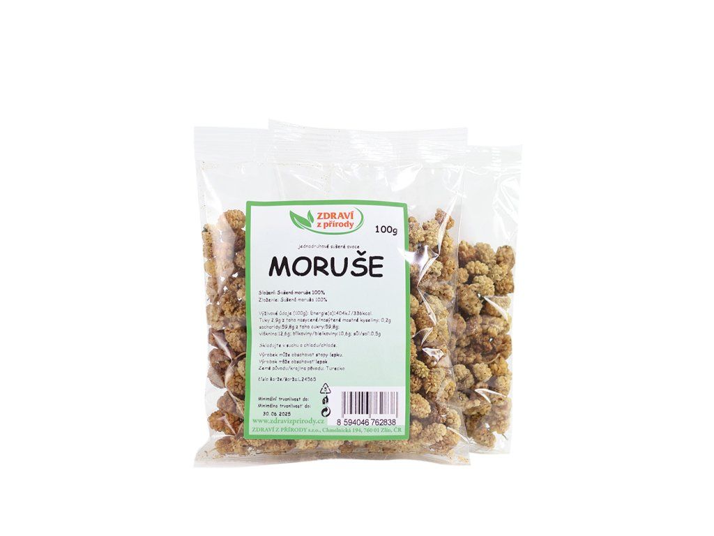 Sušené plody moruše působí jako velmi silný antioxidant, který podporuje zdraví našeho těla na mnoha úrovních. Moruše rostou na stromě morušovníku, kterému se daří v teplých a úrodných oblastech. Plody morušovníku obsahují velké množství vitamínů, předně vitamín C a vitamín K, dále obsahují železo, vápník, fosfor, hořčík, draslík, stravitelnou vlákninu, bílkoviny, až 50% obsah přírodních cukrů (glukóza a fruktóza), resveratrol - přírodní antioxidant