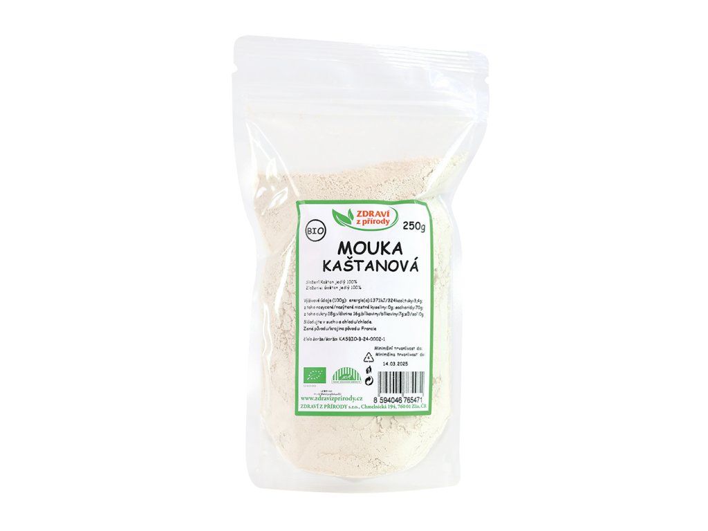 Kaštanová mouka v bio kvalitě je mletá ze sušených plodů kaštanu jedlého a je výborným obohacením k jiným moukám při vaření a pečení zejména sladkých pokrmů. Má příjemnou vůni a nasládlou chuť.