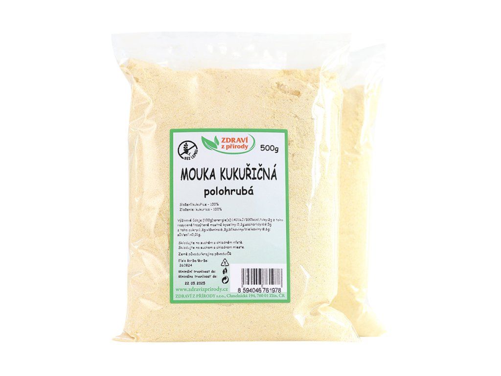 Polohrubá bezlepková kukuřičná mouka od značky Zdraví z přírody je skvělým pomocníkem při každém pečení. Je vyrobena z mletých kukuřičných zrn a je bohatá na vitamíny a minerály. Jednou z velkých výhod této mouky je rovněž vysoký obsah vlákniny. Kukuřičná mouka se díky své jemné sladké příchuti výborně hodí pro pečení sladkých i slaných pokrmů. Konzistencí se podobá klasické pšeničné mouce, kterou tak lze ve většině receptů snadno nahradit právě bezlepkovou kukuřičnou moukou.