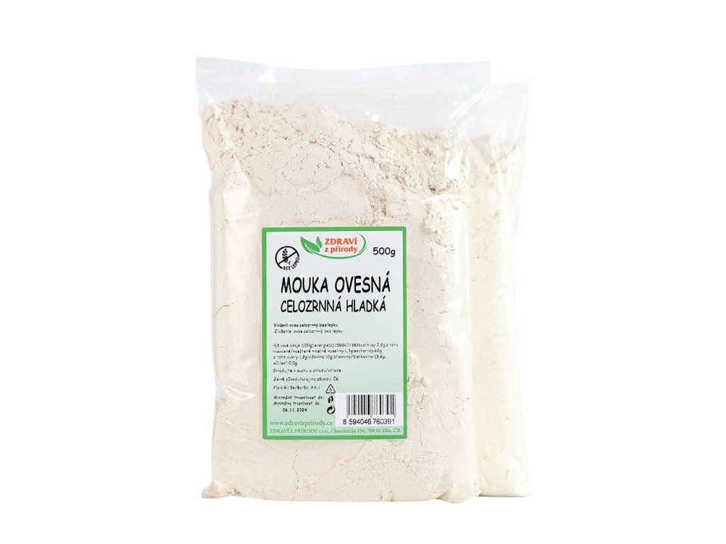 Bezlepková ovesná mouka od značky Zdraví z přírody je skvělý pomocník při vaření i pečení. Ovesná mouka je vyrobena z rozemletých ovesných vloček a je bohatá na rozpustnou i nerozpustnou dietní vlákninu. Obsahuje vitamíny skupiny B, E, fosfor, hořčík, železo a antioxidanty. Je vhodnou alternativou klasických mouk.