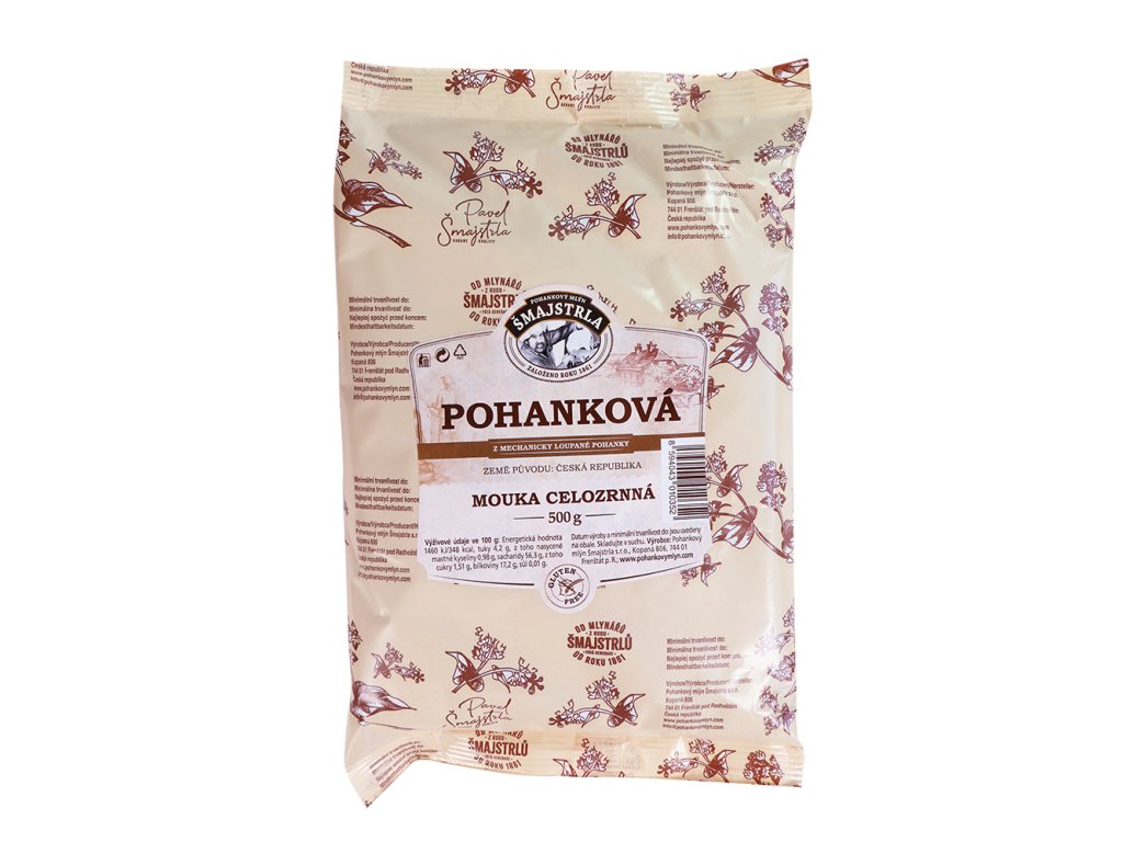 Bezlepková celozrnná pohanková mouka od společnosti Pohankový mlýn Šmajstrla je vyráběna pouze mechanickým způsobem. Při loupání dochází k tříštění zrna a díky tomu je mouka stále přirozená - živá, dobře kvasí a obsahuje všechny látky, které v pohance vyrostly. Mouka je čisté 100% namleté pohankové zrno, bez jakékoliv chemie a brouků.