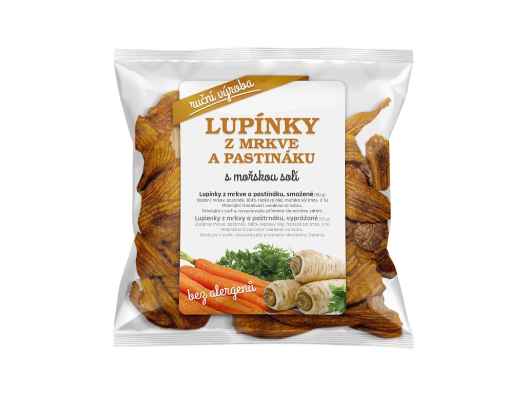 Zeleninové lupínky jsou ručně vyráběné smažené lupínky z mrkve a pastináku. Mrkev je oblíbená kořenová zelenina pro svou přirozenou sladkou chuť, obsahuje beta-karoten (provitamin A), vlákninu, vitamíny A, C a vitaminy skupiny B, minerální látky jako je draslík, vápník, hořčík, fosfor a menší množství železa, přírodní cukry a antioxidanty. Pastinák je bohatý na vitamíny C a vitamíny řady B, obzvláště B6 a kyselinu listovou, minerální látky jako je draslík, hořčík, vápník, fosfor a menší množství železa, vlákninu, antioxidanty a rostlinné silice.