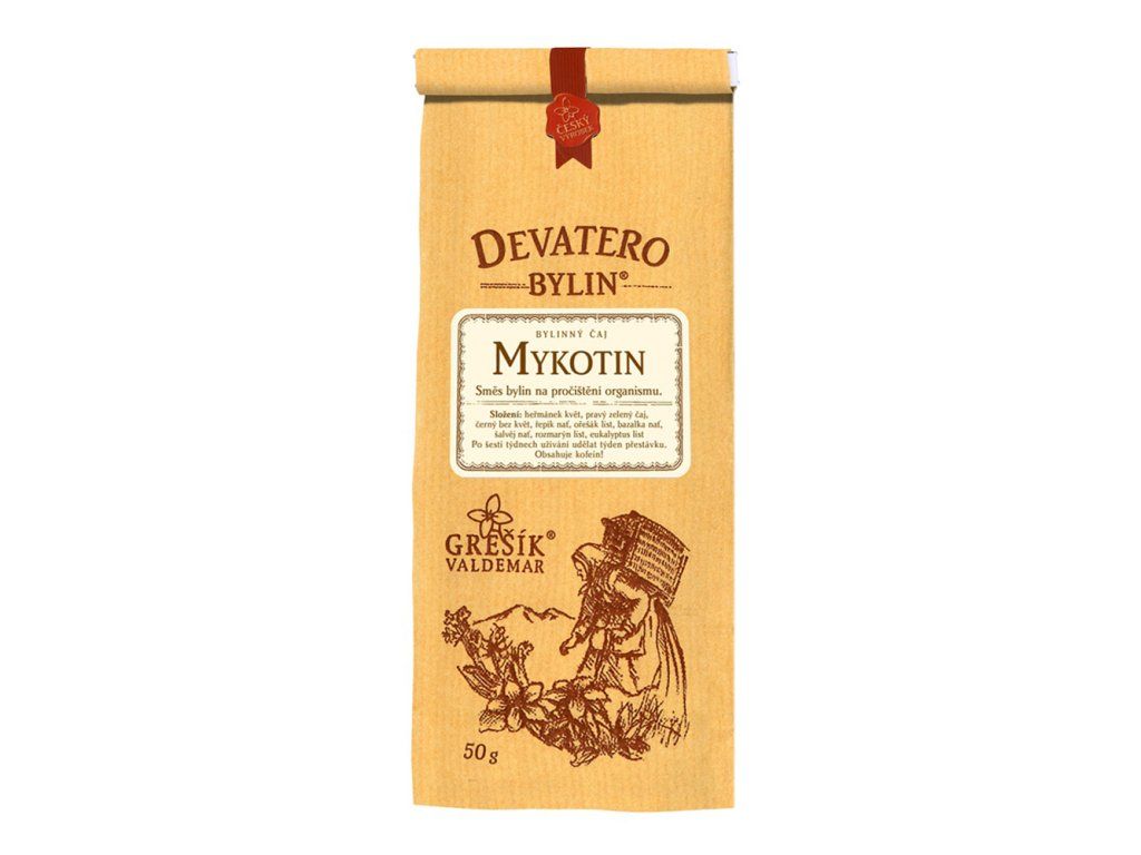Čaj nazvaný Mykotin je sypaný bylinný čaj z řady Devatero bylin s nezaměnitelným puncem jedinečnosti a kvality, vyrobený podle původní receptury Valdemara Grešíka. Směs bylin na pročištění organismu.
