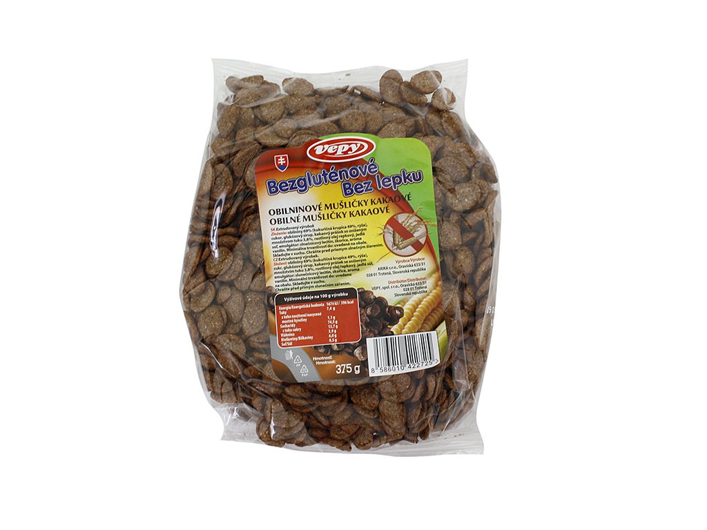 Naše nabídka bezlepkových obilných produktů značky Vepy obsahuje skořicové mušličky , kakaové mušličky , kakaové kuličky a kuličky slaný karamel.
