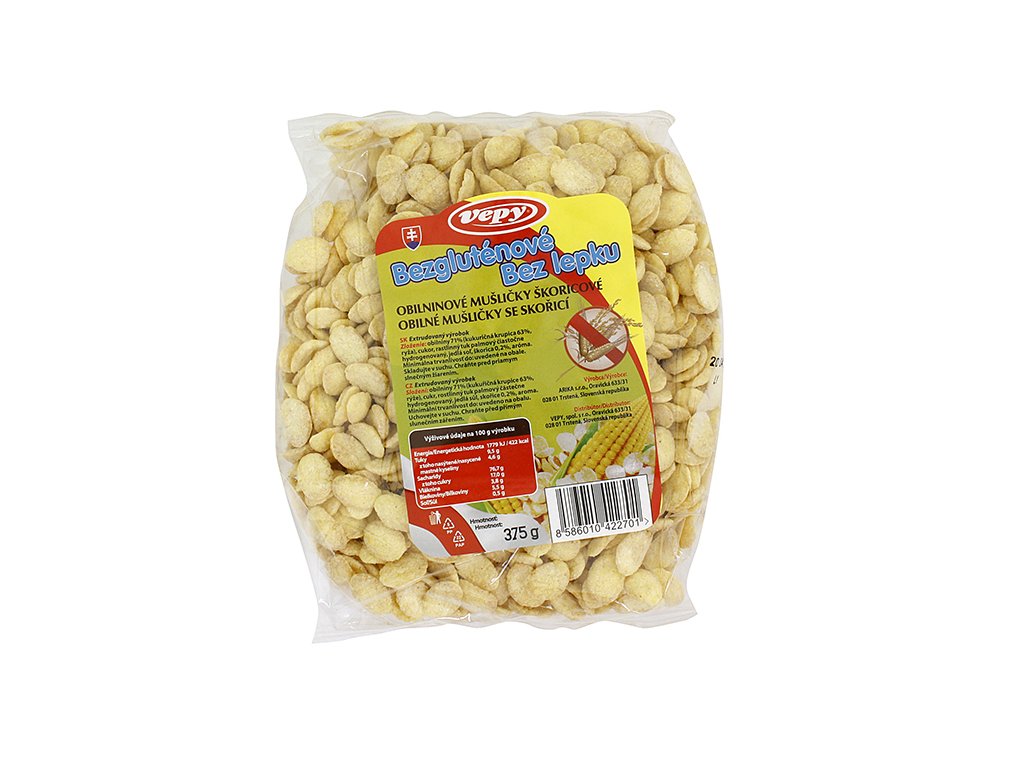 Obilné mušličky se skořicí jsou cereálie s kukuřično-rýžovým základem určené k přímé konzumaci. Kukuřice obecně je přirozeně bezlepkovou a nutričně velmi bohatou potravinou, má vysoký obsah vitamínů skupiny B, obsahuje rovněž minerální látky jako je železo, hořčík, zinek, mangan a selen. Rýže je bohatým zdrojem sacharidů s téměř nulovým obsahem tuků a obsahuje vitamíny skupiny B, minerály včetně železa, hořčíku, zinku a draslíku.
