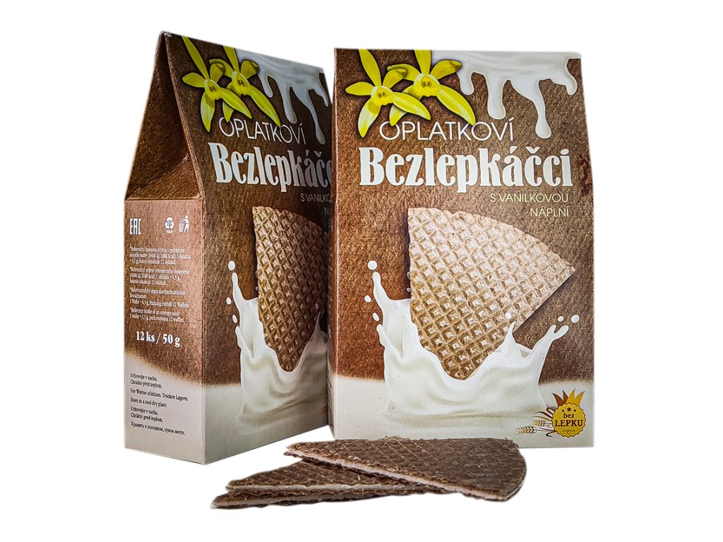 Naše nabídka bezlepkových lázeňských oplatků obsahuje: Lázeňské oplatky s čokoládovou náplní , Oplatkoví bezlepkáčci s vanilkovou náplní a Oplatkoví bezlepkáčci s čokoládovou náplní.