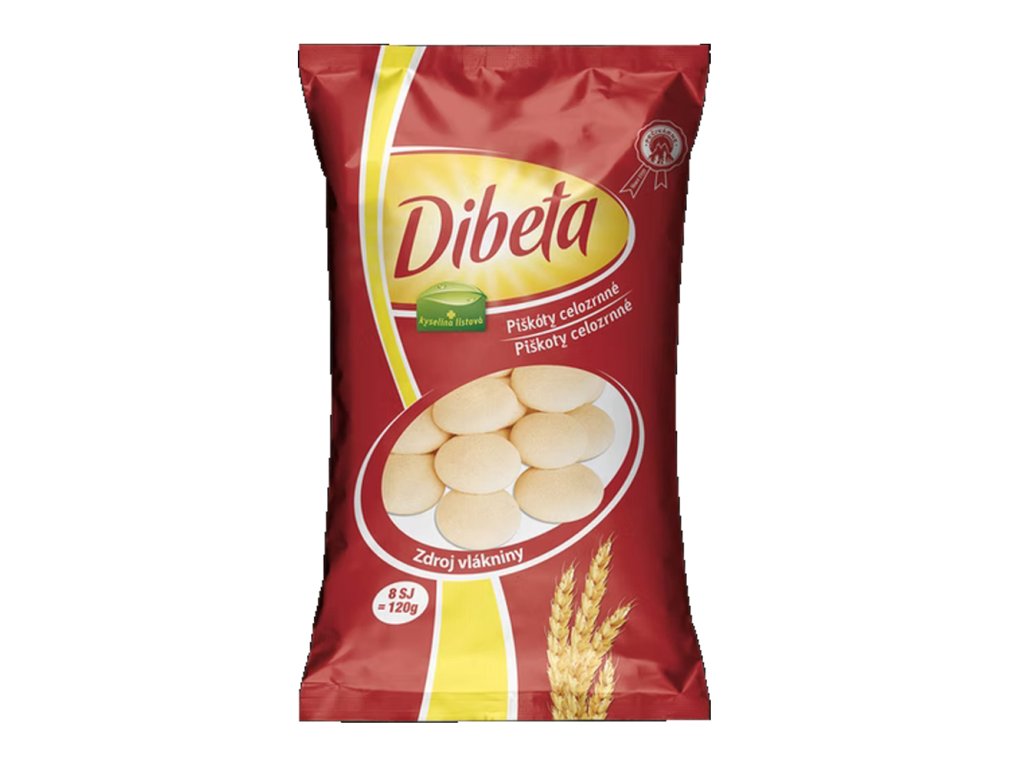 Celozrnné piškoty Dibeta jsou piškoty s fruktózou, které jsou zdrojem vlákniny, bílkovin a kyseliny listové a jsou vhodné pro lidi s intolerancí na lepek.