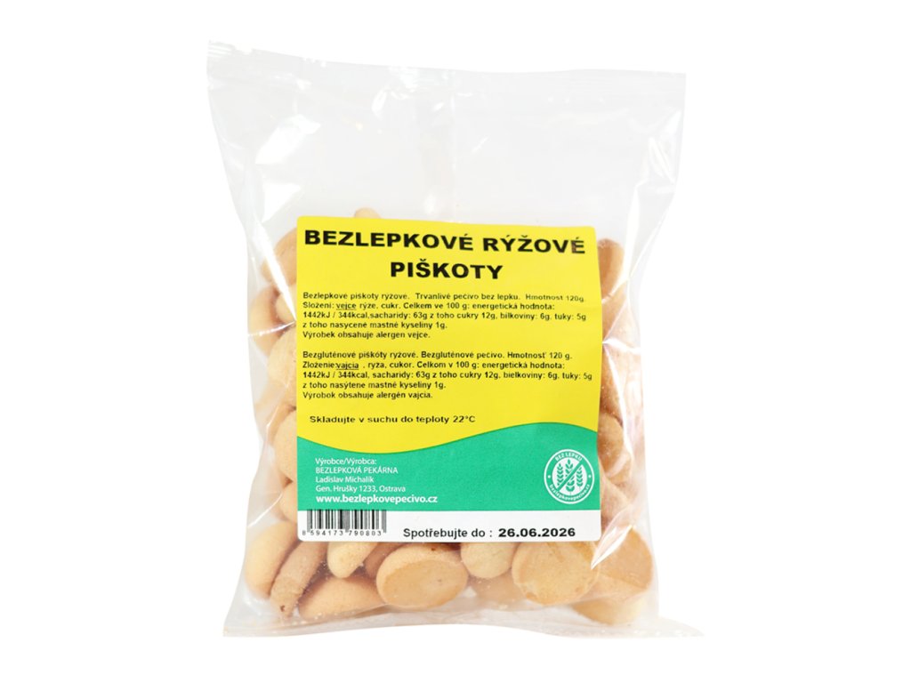 Rýžové piškoty jsou lehké, nadýchané a krásně křupavé bezlepkové piškoty určené k přímé konzumaci. Rýže je přirozeně bezlepková obilovina, která obsahuje řadu důležitých živin. Je snadno stravitelná, její hlavní složkou jsou sacharidy, menší množství bílkovin a nízký obsah tuků. Obsahuje vitamíny řady B (B1, B3, B6) a minerální látky jako je draslík, hořčík, fosfor, železo, zinek a mangan.