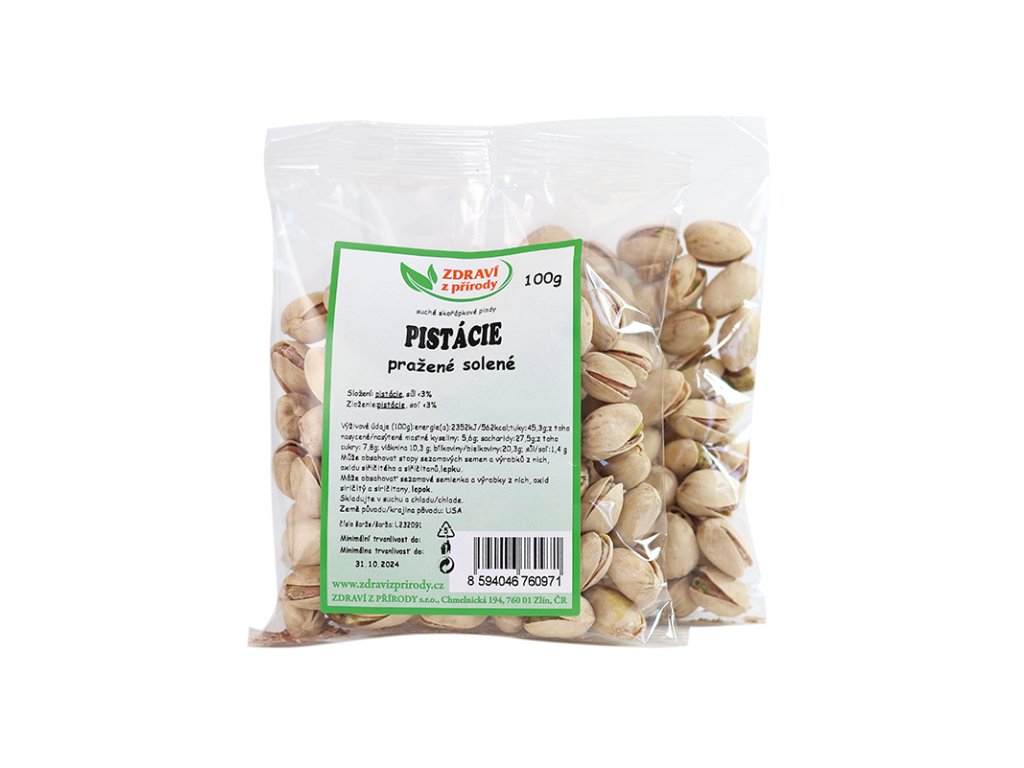 Pistácie pražené solené jsou neloupané pistáciové oříšky jemně solené, určené k přímé konzumaci. Obsahují vitamíny A, B, E, vápník, měď, hořčík, draslík a fosfor. Kromě toho obsahují také důležité antioxidanty karotenoidy a fytosteroly.