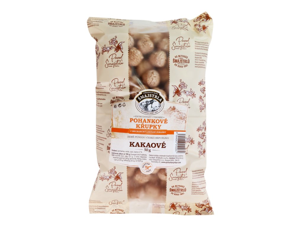 Bezlepkové pohankové křupky kakaové od společnosti Pohankový mlýn Šmajstrla jsou extrudované křupky vyráběné pouze z vlastní pohanky, lehce dochucené kakaem a cukrem, bez oleje, konzervantů, barviv a chemie.