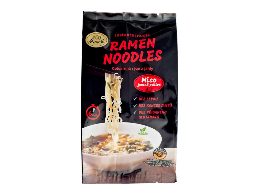 Bezlepková nudlová instantní polévka Miso od značky Ňamish Ramen Noodles je veganská polévka s bezlepkovými nudlemi vyrobenými z celozrnné rýže a jáhel. Aromatický jemně pálivý vývar s mořskou řasou wakame zasytí nejen doma, ale také v také v práci a na cestách. Polévka Ňamish je vhodnou a praktickou volbou pro rychlé a teplé jídlo.