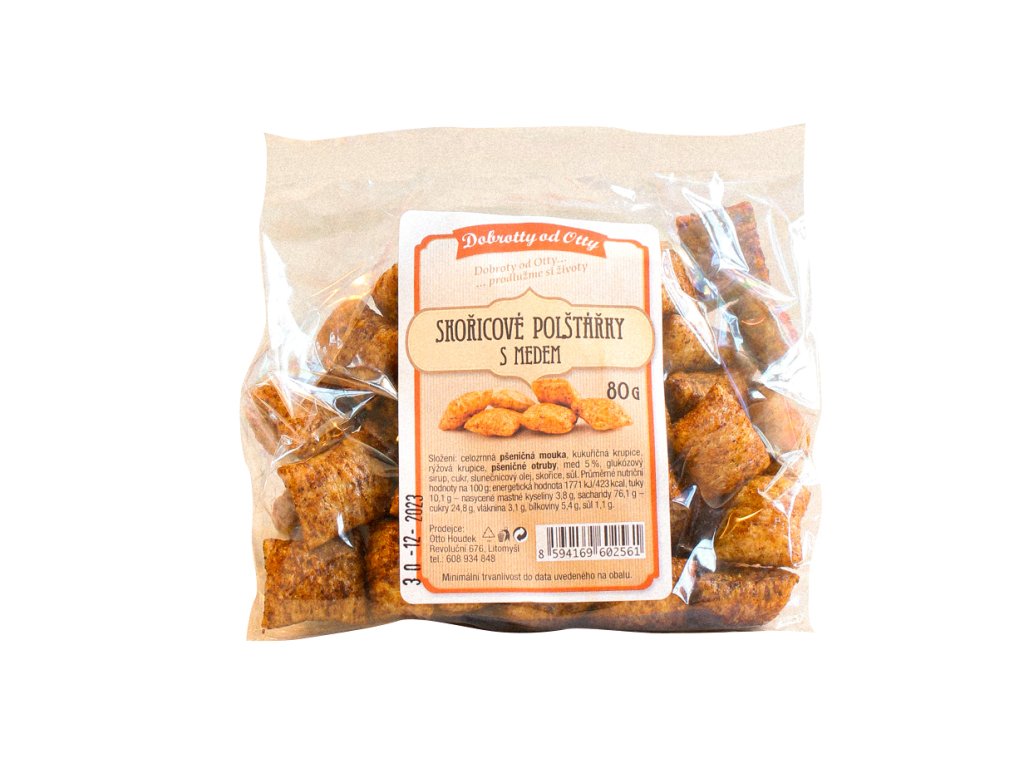 Skořicové polštářky s medem jsou cereálie obohacené o vlákninu v podobě pšeničných otrub. Pšeničné otruby jsou velmi jemné části obilného zrna, které zůstanou po zpracování pšenice na bílou mouku. Obsahují nejen okrajové části zrna, ale také klíčky. Otruby všeobecně jsou velmi ceněny pro svůj vysoký obsah vlákniny a přirozený prebiotický účinek. Obsahují mangan, selen, hořčík, fosfor, železo, zinek, měď a draslík, vitamíny řady B, konkrétně B1, B2, B3, B5, B6 a B9 a vitamín E. Skořice obsahuje cinnamaldehyd, což je látka odpovědná za charakteristickou vůni a chuť skořice. Dále obsahuje silice, bílkoviny, sacharidy, vlákninu, minerály (vápník, železo, hořčík, fosfor, mangan, draslík, měď, zinek, sodík, selen) a vitamíny (C, E, K, lutein), také nenasycené mastné kyseliny, betakaroten a kyselinu listovou. Má antioxidační, protizánětlivé, antibakteriální a protiplísňové účinky.
