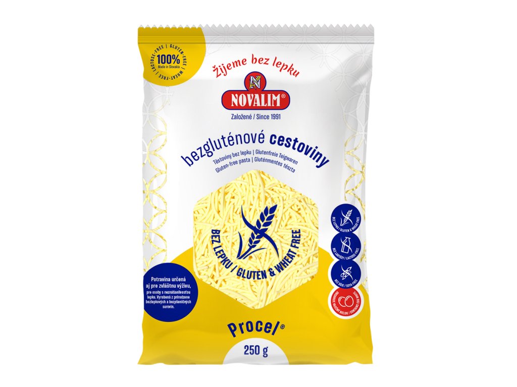 Bezlepkové těstoviny PROCEL jsou standardní bezlepkové těstoviny na bázi kukuřičného škrobu s obsahem vaječného bílku. Jsou vyrobeny z přirozeně bezlepkových a bezpšeničných surovin a proto jsou vhodné pro osoby s alergií na lepek.