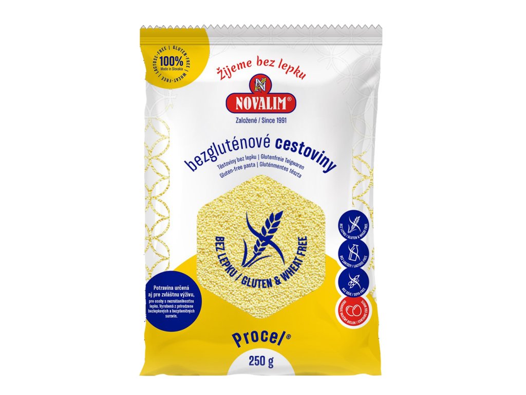 Bezlepkové těstovinové kuličky PROCEL jsou standardní bezlepkové těstoviny na bázi kukuřičného škrobu s obsahem vaječného bílku. Jsou vyrobeny z přirozeně bezlepkových a bezpšeničných surovin a jsou proto vhodné pro osoby s alergií na lepek. Pokud tedy chcete kvalitní, zdravou, tradiční přílohu k obědu nebo zavářku do polévky, pak neváhejte a vyzkoušejte tyto těstoviny od značky Novalim.