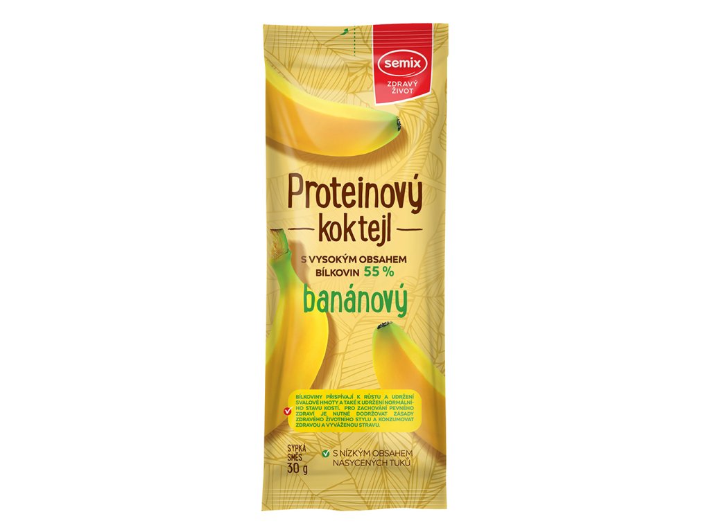 Banánový proteinový koktejl je sypká směs určená k rychlé přípravě nápoje s vysokým obsahem bílkovin se sušeným banánem.