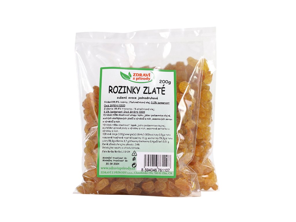 Zlaté rozinky jsou sušené hrozny, které obsahují velké množství sacharidů. Jsou bohatým a rychlým zdrojem energie pocházející z přírodních cukrů. Lze je konzumovat samotné jako mimořádně zdravou svačinku, nebo se přidávají do cereálních směsí, jogurtu a dalších pokrmů. Jsou výbornou variantou originálního rychlého občerstvení, při chuti na něco sladkého nebo jako sladká tečka po jídle. Jsou zárukou mlsání bez viny, jelikož obsahují množství minerálních látek a vitamínů. Jako rychlý, chutný a zdravý zdroj energie jsou dobrým a praktickým společníkem při cestování a sportu.