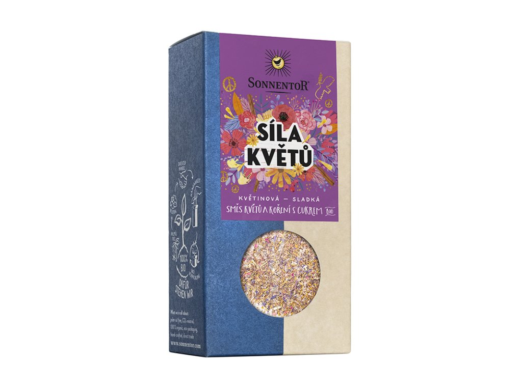 Síla květů je květinová sladká směs kvítků a koření s cukrem určená na vše sladké ať už teplé nebo studené. Barevné květy dokáží okouzlit nejen estetickým "dotykem". Směs na bázi řepného cukru s květy chrpy, skořicí a vanilkou doladí všechny dezerty a moučníky. Kdo chce zkrášlit šlehačku, krém nebo zmrzlinu, měl by mít směs Sílu květů doma.