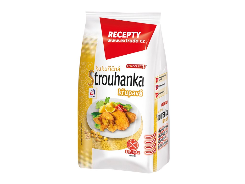 Bezlepková kukuřičná strouhanka od společnosti Extrudo je křehká a křupavá, oproti klasickým strouhankám tolik nesaje tuk, nepřipaluje se a je dobře přilnavá.