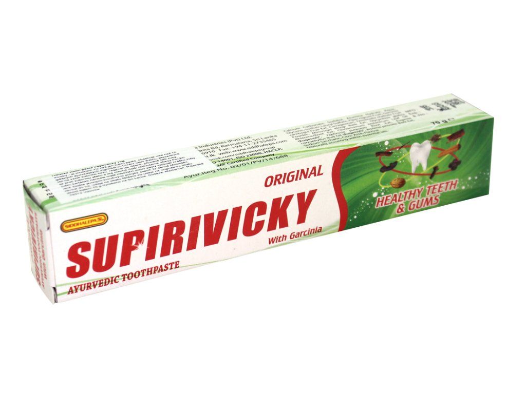 Zubní pasta Supirivicky je bylinná ajurvédská zubní pasta vyrobená na Srí Lance. Kombinace účinných ajurvédských bylin zajišťuje antibakteriální účinky, protizánětlivý efekt, může podpořit zpevnění dásní a prevenci zubního plaku a kazu a zápachu z úst. Má blahodárný účinek na stav dásní a zabarvení skloviny.
