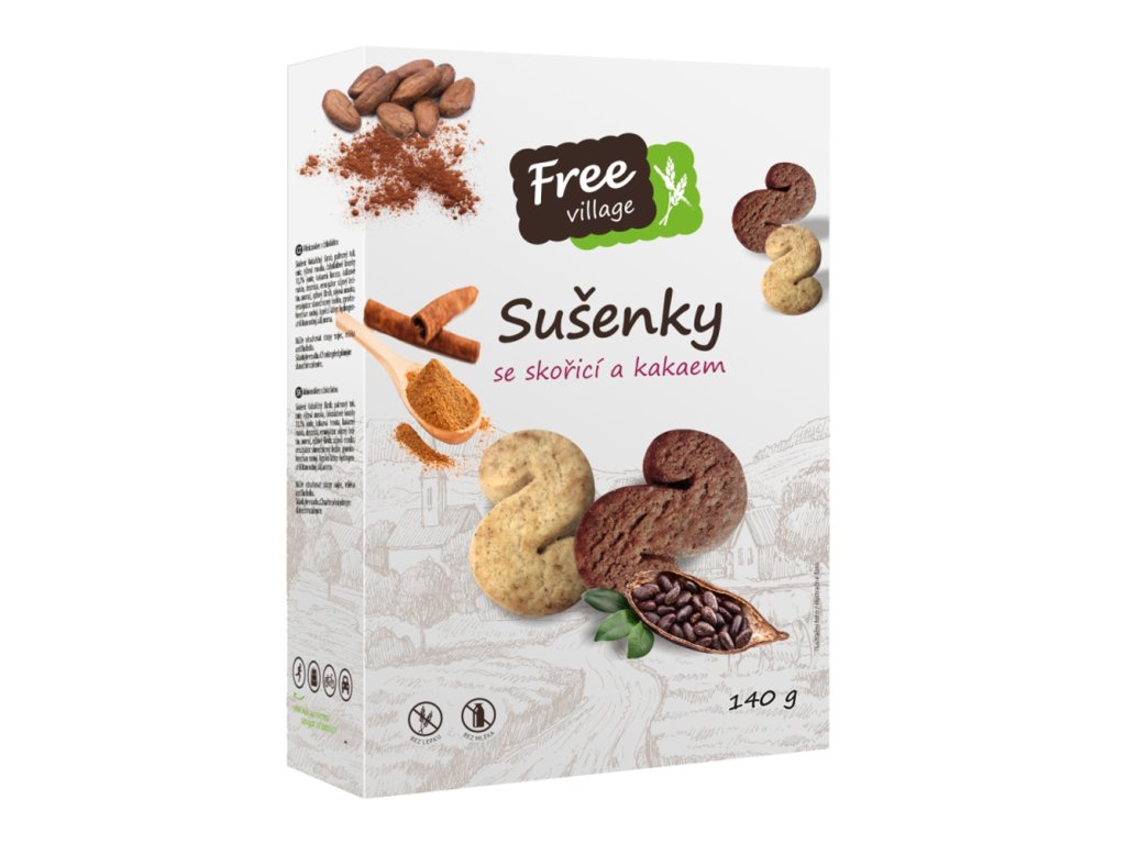 Bezlepkové sušenky se skořicí a kakaem jsou dva druhy sušenek ve tvaru esíček - kakaových a skořicových, v jednom balení. Sušenky jsou vyrobené z kvalitních bezlepkových surovin, jsou vhodné pro osoby s celiakií a pro každého, kdo hledá chutné bezlepkové mlsání.