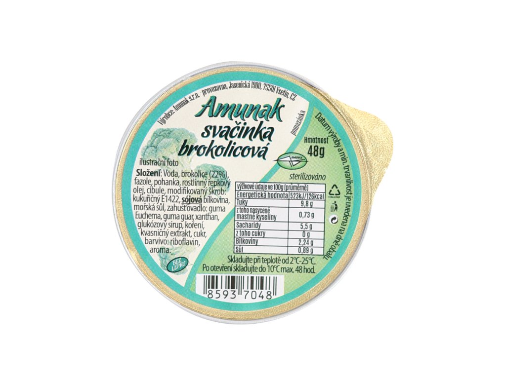 Bezlepková brokolicová pomazánková svačinka od české společnosti Amunak je rostlinná paštika zhotovená z brokolice, fazolí a pohanky v praktickém balení, vhodná k využití pro rychlou svačinku nejen doma, ale také v práci, na výletech nebo při cestování. Brokolice je zelenina bohatá na vitamíny, minerály a vlákninu, která má pozitivní vliv na zdraví. Obsahuje vitamíny C, A, K, B9 (kyselina listová) a další vitamíny skupiny B. Z minerálů je významný obsah draslíku, vápníku, hořčíku a železa. Fazole obsahují velké množství bílkovin, vitamíny skupiny B a vitamín E. Kromě toho jsou fazole bohaté na fosfor, draslík, hořčík, vápník, a železo a lecitin. Pohanka je pseudoobilovina, která obsahuje velké množství minerálních látek jako je zinek, měď, selen, mangan a další stopové prvky. Z vitamínů obsahuje vitamíny skupiny B - B1, B2, B3, dále vitamín C a E.