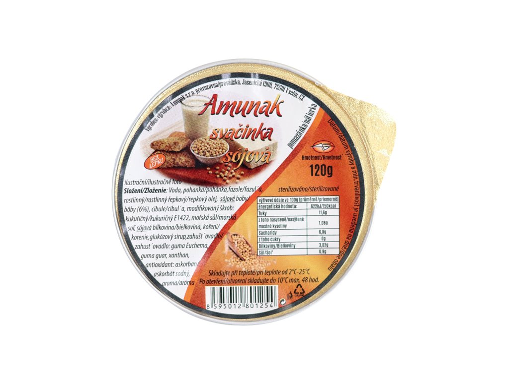Bezlepková sójová pomazánková svačinka od české společnosti Amunak je rostlinná paštika zhotovená z fazolí a pohanky v praktickém balení, vhodná k využití pro rychlou svačinku nejen doma, ale také v práci, na výletech nebo při cestování. Fazole obsahují velké množství bílkovin, vitamíny skupiny B a vitamín E. Kromě toho jsou fazole bohaté na fosfor, draslík, hořčík, vápník, a železo a lecitin.Pohanka je pseudoobilovina, která obsahuje velké množství minerálních látek jako je zinek, měď, selen, mangan a další stopové prvky. Z vitamínů obsahuje vitamíny skupiny B - B1, B2, B3, dále vitamín C a E. Pohanka je oblíbená nejen pro svou specifickou oříškovou chuť, ale také pro vysoký obsah bílkovin, rutinu (vitamínu P) a svůj zahřívací charakter. Komplexní sacharidy pohanky se do těla uvolňují postupně a proto jsou vhodným zdrojem energie. Sójové boby jsou bohatým zdrojem živin a obsahují širokou škálu vitamínů, minerálů a dalších prospěšných látek. Konkrétně v nich najdeme vitamíny skupiny B (B1, B2, B3, B5, B6), vitamíny E a K, beta-karoten, biotin, kyselinu listovou a minerály jako je vápník, jód, železo, hořčík, mangan, fosfor, draslík, selen a zinek. Dále jsou sójové boby zdrojem vlákniny, bílkovin, složitých sacharidů, omega-3 a omega-6 nenasycených mastných kyselin a lecitinu.