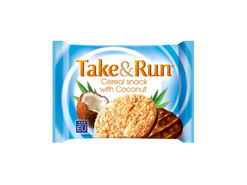 Ovesná sušenka Take&Run je trvanlivá sušenka s kokosem máčená v polevě, v praktickém balení, vhodná nejen na doma, ale také do školy, do práce, na výlety a pro cestování.