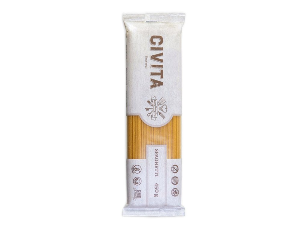 Kukuřičné špagety Civita jsou sušené bezlepkové a bezvaječné těstoviny vyrobené z ne geneticky upravené kukuřičné mouky s vysokým obsahem vlákniny a nízkým glykemickým indexem. Jedná se o přírodní produkt bez chemikálií a dalších aditiv vyrobený z ne genenticky upravené kukuřice pěstované v Maďarsku. Špagety obsahují karotenoidy a antioxidanty. Kukuřice obecně je přirozeně bezlepkovou a nutričně velmi bohatou potravinou, má vysoký obsah vitamínů skupiny B, obsahuje rovněž minerální látky jako je železo, hořčík, zinek, mangan a selen.
