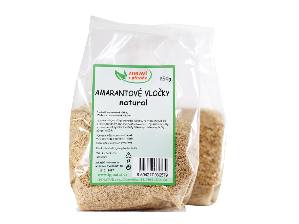 Amarantové vločky prodejní značky Zdraví z přírody jsou přírodní přirozeně bezlepkové obilovinové vločky vyrobené z loupaných zrn amarantu – starodávné pseudobiliny s výbornou výživovou hodnotou. Díky své jemné chuti a lehké struktuře jsou ideální pro zdravé snídaně, vaření i pečení. Jsou snadno stravitelnou potravinou určenou k zahušťování jídel a pokrmů, lze je přidat do kaší, polévek a nákypů nebo je lze využít při přípravě domácího pečiva.