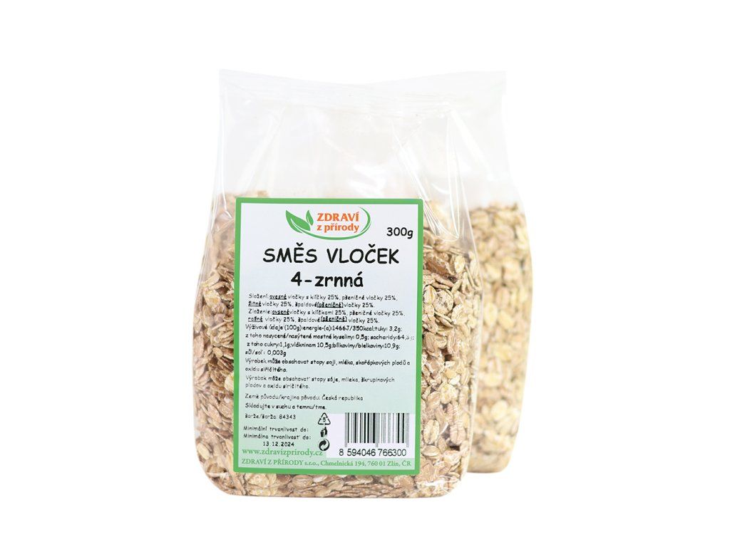 Čtyřzrnná směs vloček obsahuje ovesné, pšeničné, žitné a špaldové vločky. Tyto vločky jsou bohatým zdrojem komplexních sacharidů, ale také vlákniny, která podporuje zdravé trávení. Díky zachování vnějších obalových vrstev (otrub) jsou vločky velmi zdravé a bohaté na vlákninu. Tato směs vloček je velmi praktickým pomocníkem v kuchyni, kde usnadní přípravu běžných jídel. Vločky jsou snadno stravitelnou potravinou určenou k zahušťování jídel a pokrmů, k přípravě sladkých a slaných kaší, lze je přidávat do jogurtů a nákypů.